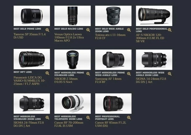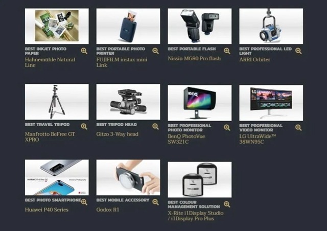 本届 TIPA 摄影器材共分为 40 个小类,涉及相机、镜头、相纸、软件、存储、附件、灯光、显示器等不同产品。其中有四家国产品牌入选,分别是最佳单反微距镜头:老蛙 100mm F2.8 2x Ultra Macro APO、最佳专业照片显示器:明基 PhotoVue SW321C、最佳移动附件:神牛 R1 以及最佳拍照手机:华为 P40 系列。