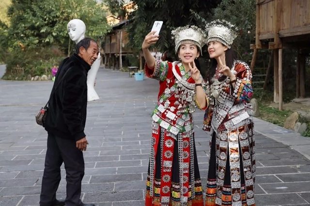 苗家村寨,两位美女游客身着民族盛装陶醉在自拍中,怀抱残缺衣模的过路村民好奇回眸,形成某种偶遇般反差强烈的巧合,成为了画面趣味点,作者巧妙地将这一有趣的陪体元素纳入画面,以此对主体加以烘托,令观者视线瞬间被吸引,看出作者对现场的快速反应和娴熟的捕捉能力。作者以准确的瞬间抓拍,定格下了这一充满趣味性的温馨一幕,人物表情生动,画面简洁明快。