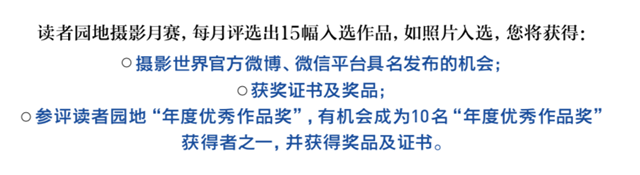 相信一直关注摄影君的朋友们对《摄影世界》“读者园地” 栏目并不陌生。“读者园地” 致力于为大家搭建一个互动平台,在这个平台上,我们可以一起分享照片和体验,感受作者对生活的理解和对真善美的感悟。