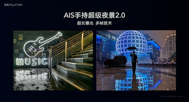 在暗光或夜景环境下,荣耀 Play4T Pro 主摄将会进行 4 合 1 像素融合,增大单个像素的进光量;而且结合全新一代荣耀猫头鹰算法,突破视觉暗光限制。同时,荣耀 Play4T Pro 加入 AIS 手持超级夜景 2.0 技术,通过超长曝光以及多帧合成,配合手持 AIS 防抖,随时随地捕捉夜晚的精彩。