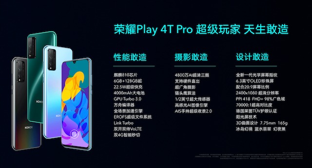 荣耀 Play4T Pro 搭载 “越级神 U” 麒麟 810,带来了强劲性能和畅快体验; 4800 万高感光夜拍三摄,配合 AI 场景识别技术,带来随时随地拍大片的拍照体验;AMOLED 珍珠屏、全新一代光学屏幕指纹,在保证轻薄机身的同时配备 4000mAh 大电池和超级快充,让荣耀 Play4T Pro 兼具颜值和实力。 荣耀 Play4T 在设计、摄影、性能方面的表现同样可圈可点。