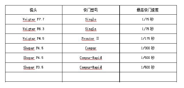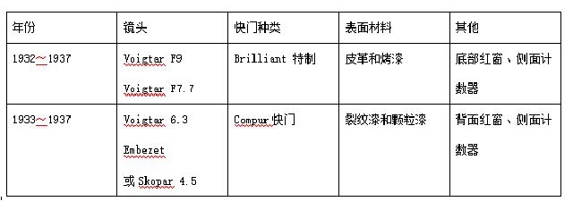 计数红窗的改变则是为了适应胶卷的变化(图 2 右侧相机)。金属机身相机的档次在各个机型之间有很大差距,原型机仅配备了最大光圈 F9 的 Voigtar 镜头和最快速度为 1/50 秒的三速 Brilliant 特制快门,而最高档机型则配备了 1︰4.5 口径的 Skopar 镜头和最快速度为 1/300 秒的八速 Compur 快门(图 3)。