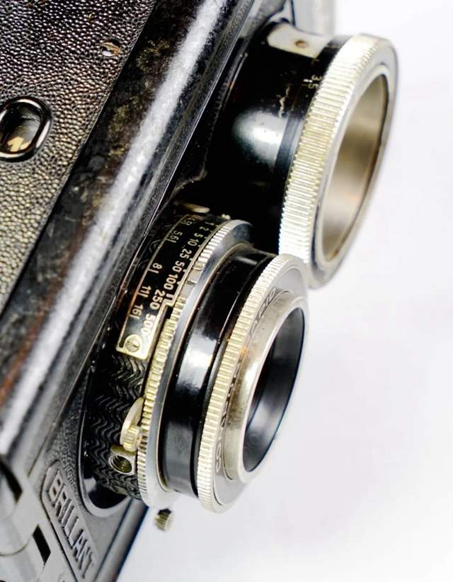1938 年,福伦达推出了 Brilliant S 型(图 8),仍然是塑料机身,但通过取景镜头与成像镜头之间齿轮啮合机构实现了两个镜头的联动对焦取景,使 Brilliant 成为真正意义上的双镜头反光相机。