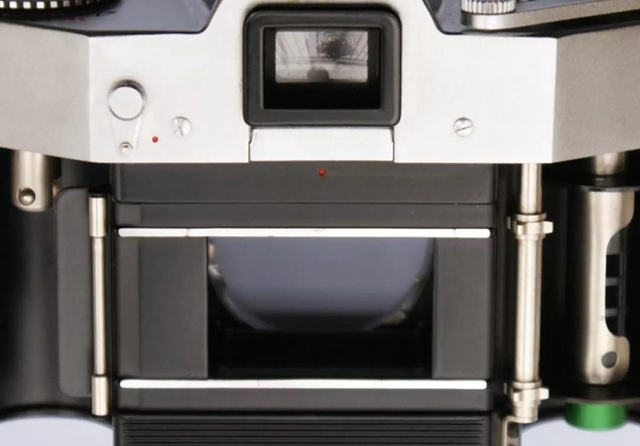 而且,取景器内还设计了快门释放指针(图 8),当快门释放后取景器内左上角会出现红色指针,提示当前底片已完成一次曝光。如需二次曝光,只要按住回片钮再度拉动卷片搬把,此时胶卷将停止过片,仅完成快门上弦,多次曝光同样方式操作。