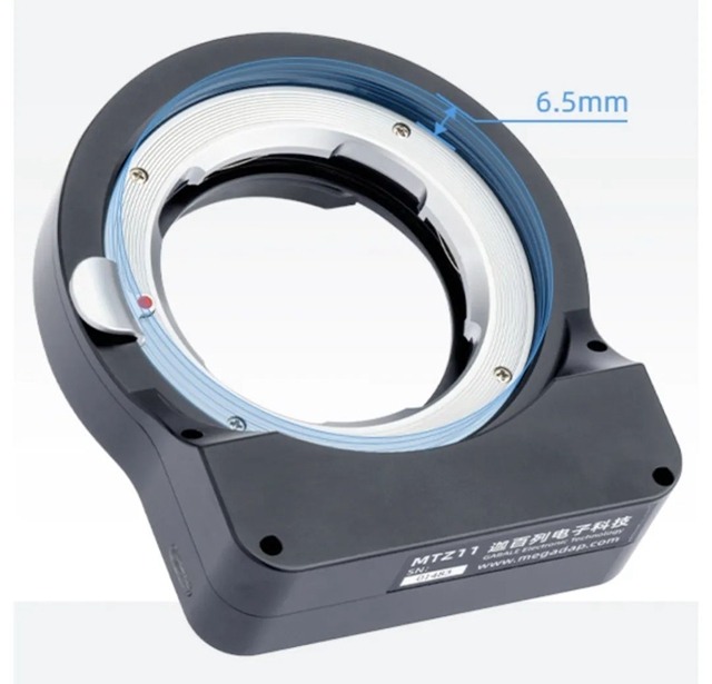 尼康 Z 系列全画幅无反相机卡口直径 55 毫米,法兰距 16 毫米,大卡口直径和短法兰距非常适合转接。这款转接环厚度较大,下边多出一个盒装物。内置对焦马达和螺旋对焦传动机构,可以带动镜头整体前后移动最多 6.5 毫米,从而实现自动对焦。其原理与 30 年前焦平面前后移动自动对焦的康泰时 AX 相同,只是转接环上没有自动对焦系统,只有对焦驱动系统。要先将对焦信息通过触点传送到机身上自动对焦系统计算,再接受机身对焦系统的指令驱动镜头移动对焦,对焦点、对焦模式选择也从机身上操作。