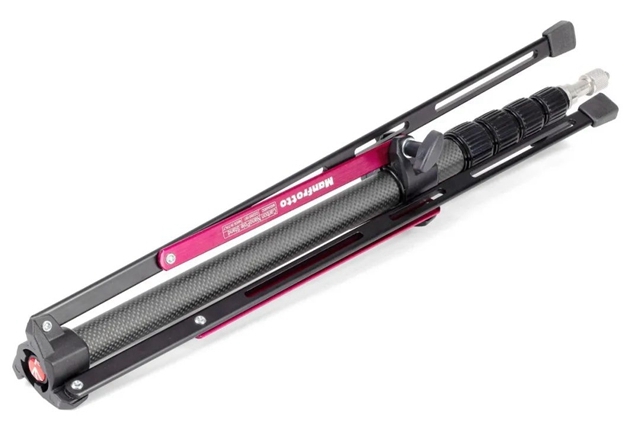 这只灯架的支架部分采用铝合金制成,中轴部分采用质轻的碳纤维制成。收缩反折后长度仅为 0.51 米,包括转接头重 780 克,是曼富图灯架中最轻的。打开后最低高度 0.61 米,最高高度 1.97 米,最大负重 1.5 公斤,足以承担一只 200-300 瓦的外拍灯和一个灯伞/柔光罩的重量,可以满足大部分室外拍摄的需要。它的中轴可以拆下来,单独作为外拍灯延长杆使用,非常方便。这只灯架的国内价格为 1399 元。