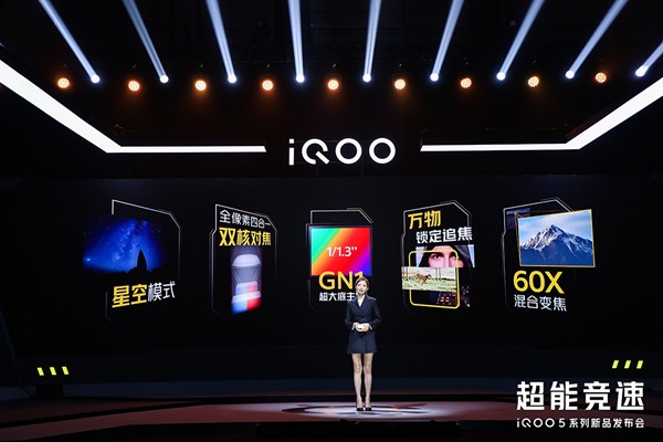 iQOO 5 系列全面升级超感光影像系统,配备超大尺寸传感器——三星 GN1,拥有更大单位像素尺寸、支持双核对焦,可带来更快对焦速度、更大进光量和更高信噪比,实现媲美单反的低光照图像质量,为用户在明暗复杂场景下的拍摄,带来更好的曝光表现和细节还原能力,暗光环境下带来更好的噪点控制。