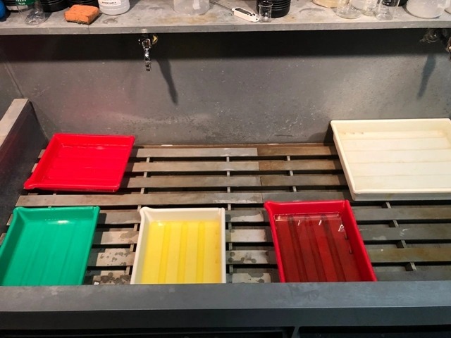 常规冲片方式可以分为 “盘显” 和 “罐显”。盘显就是用 6 个冲洗专用塑料盘,倒入药液后,在全黑的环境中完成冲洗流程。我们可以选择对胶片少翻面、多晃盘的方式,减少由于手指甲或显影盘底有杂质造成的划痕。