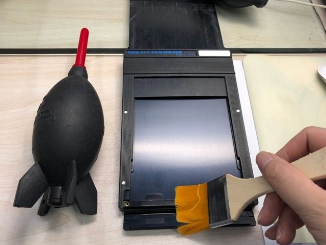 所以,除了将胶片装入片夹之前需要用刷子和气吹清洁灰尘,拍摄前、冲洗前也都可以再次清洁片夹外部。