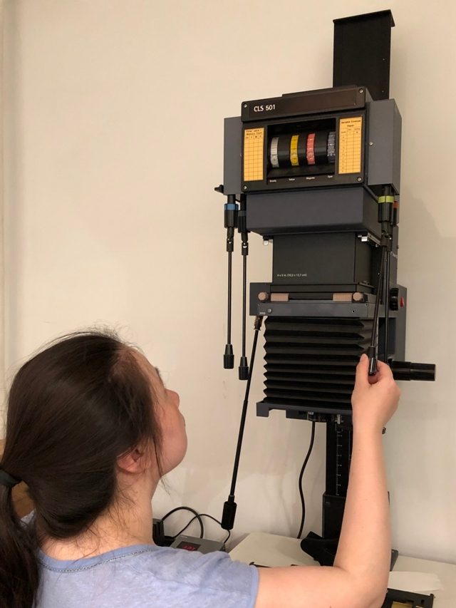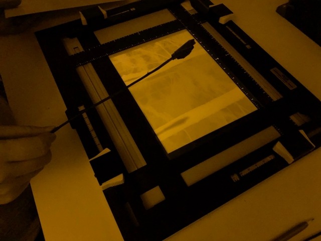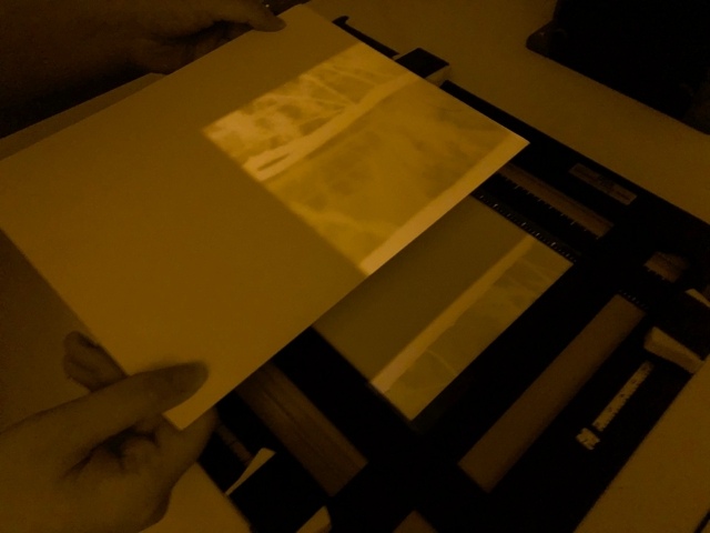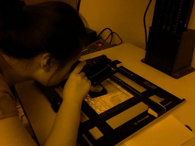 放大时需要在暗房钠灯下,对焦、找反差、找正确曝光时间和局部加减光。每一步都需要对相纸试条曝光后过药水冲洗。