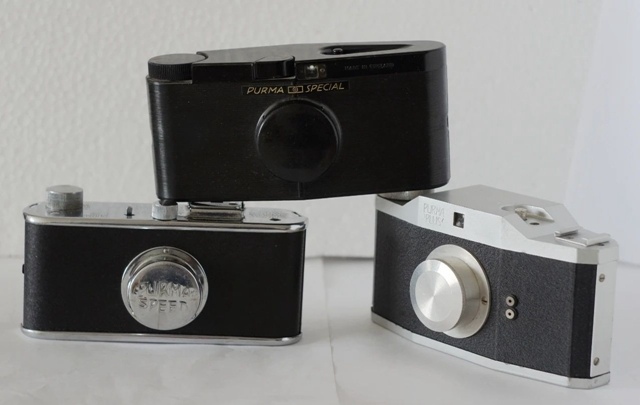 三款 Purma 相机的共同特点是:1. 都使用 127 胶卷。127 胶卷是缩小的 120 胶卷,宽 46 毫米,后有背纸,可以拍 42×42 毫米画幅照片 12 张,或者 42×32 毫米画幅照片 16 张。2. 都是平视取景相机,使用只有一挡光圈的可伸缩式镜头,拍摄时伸出机身,平常则压缩在机身内节省空间。相机的镜头盖兼具防误拍功能,当镜头盖旋扣在镜头上处于保护状态时,快门按钮无法按下。3. 没有调焦机构,依靠小光圈镜头的较大景深获得相对清晰的图像。4. 都使用公司创始人 Alfred C Mayo 设计并获得专利的重力控制快门机构,有至少 3 挡快门速度。