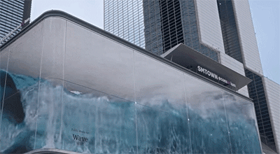 近日,韩国知名 COEX 商业中心南侧的大型 LED 曲面屏播放了一组巨型海浪画面,凭借逼真的视觉和音效,给观众带来水随时可能打破玻璃而洒向人行道的错觉,很多人看后直呼太逼真,对走在下面的心脏病患者不太友好的样子。