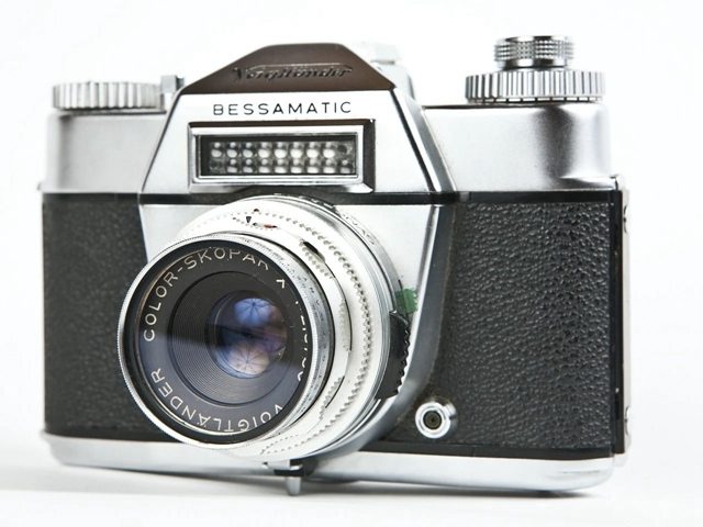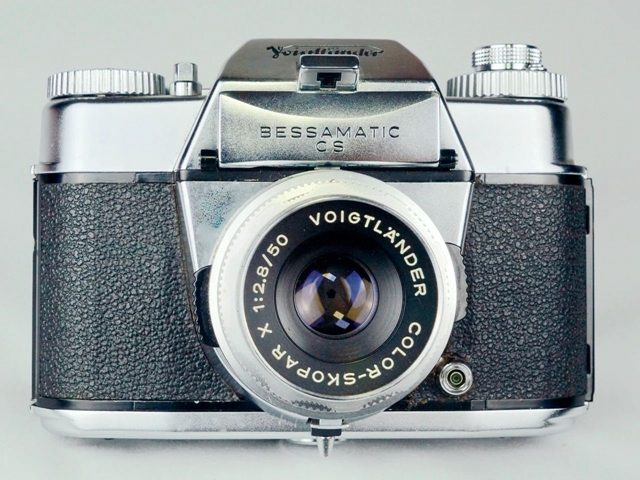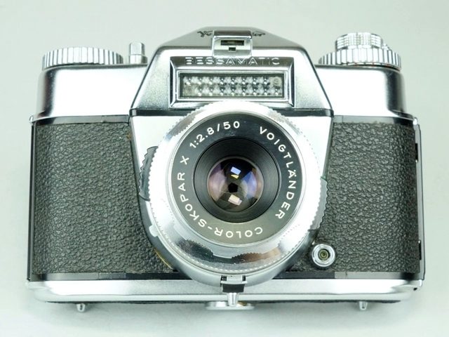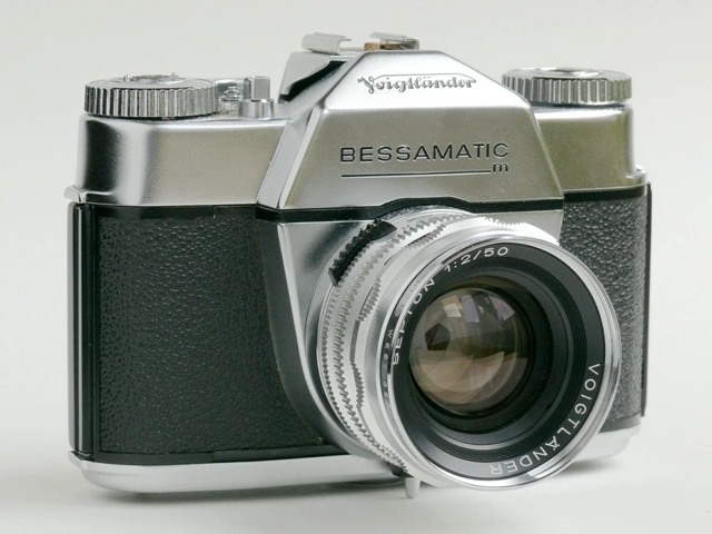 1959 年福伦达推出了首款单反相机 Bessamatic(图 1)。它的竞争对手是蔡斯伊康的 Contaflex 和柯达的 Retina Reflex 单反相机。这款单反相机配备 Color-Skopar X 50mm F2.8 口径标准镜头,裂像对焦,采用 Synchro-Compur 页片快门,最快速度 1/500 秒。