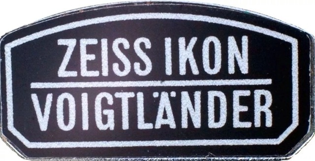 在这块小小的铭牌上,ZEISSIKON 在上,VOIGTLANDER 在下,之间用一条横线隔开,密密麻麻的 20 个大写字母几乎占据了标志的全部空间,既不醒目也缺乏美感(图 15),体现了蔡斯伊康公司既想利用福伦达的品牌又不愿意让它占据主导地位的矛盾心理。