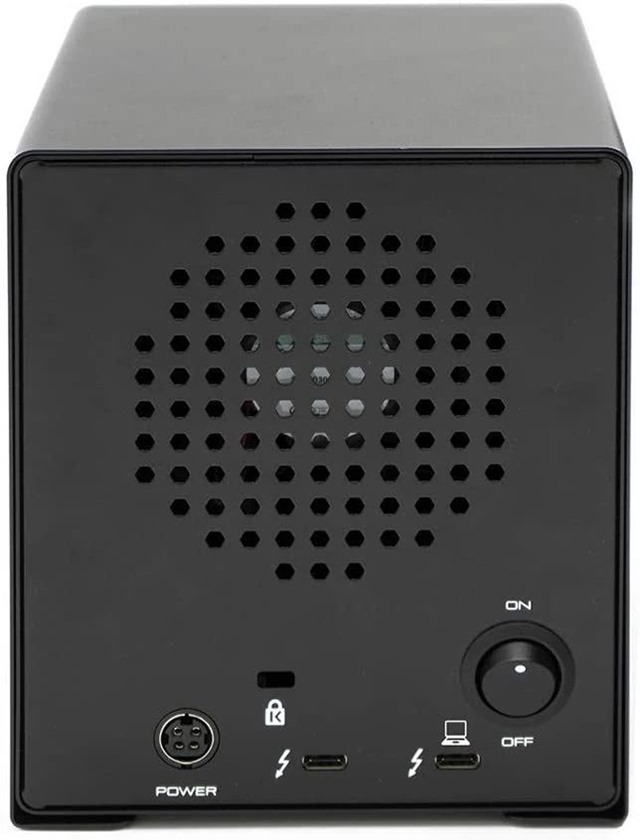 另一款产品为有 4 个插槽的组合式存储器。它看起来像一个桌面文件柜,体积 120×145×155 毫米,重约 2.7 公斤。正面有 4 个插槽,背面有电源开关、电源线插孔、2 个雷电 3 接口和降温风扇出风口。它同样可以用 于 Windows 10 或 MacOS 10.12 系统的电脑,最高传输速度 40GB/秒。