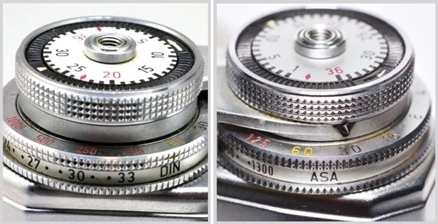 “独眼龙” 的快门按钮、计数器转盘、快门数值转盘(兼曝光补偿)、感光度转盘都是联动的(见图 2),胶卷感光度范围是德制 9~33 DIN 或者美制 ASA 5~1300,感光度的设定会直接限制快门范围。