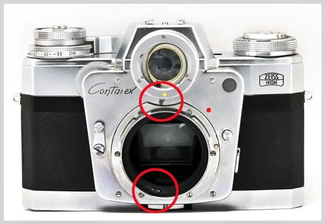 同时镜头卡口内的下方也有一个光圈拨叉与镜头光圈连接同步调整(图 10 下方的红圈)。“独眼龙” 镜头收放光圈都是由机身内的这个光圈拨叉控制,当转动光圈拨轮时这个拨叉就给镜头光圈定位了。
