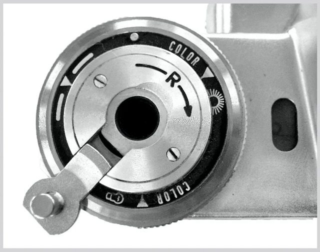 “独眼龙” 机顶左侧是一个带备忘盘的大旋钮(见图 11),备忘盘上提示了彩色日光型、彩色灯光型和通用型三个三角标,定位参照点就是退卷标示 “R”。退卷时,既可以转动大旋钮,也可以向外翻出退片摇把,转动摇把退卷。