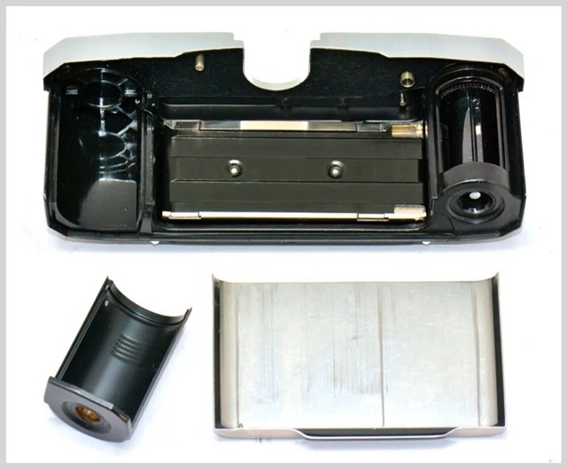 倒完胶卷后再旋开机底另一侧开后盖旋钮(图 12)即可卸下后背取出胶卷。“独眼龙” 的后盖与康泰时(Contax)旁轴系列一样,都是整体拆卸的,内部十分简洁(图 13),卷片轴可拆卸,操作不便又容易丢。