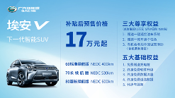 4 月 27 日,广汽新能源埃安系列最新车型以 “云预售” 的形式全球首发。广汽新能源总经理古惠南在线宣布:“下一代智能 SUV 埃安 V,将推出 60 标准续航版、70 长续航版和 80 超长续航版三个版本,其 NEDC 续航分别达到 400km、530km 及 600km,补贴后预售价格 17 万元起。”